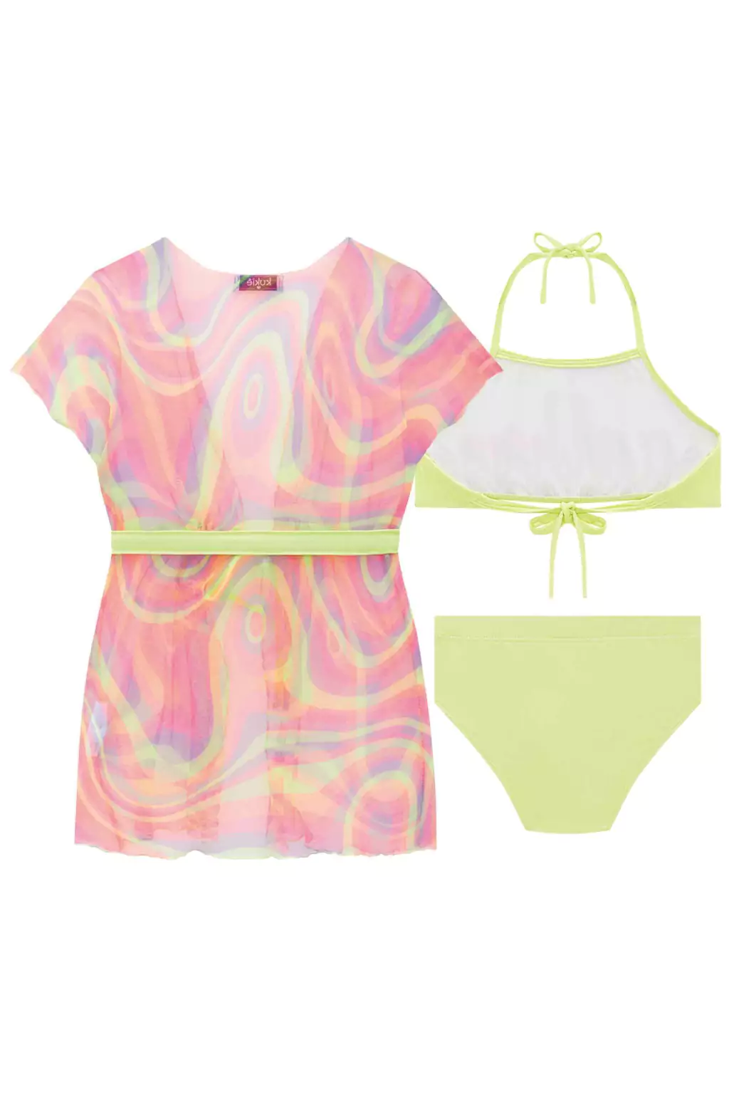 Composição: Saída de Praia 90% Poliéster/ 10% Elastano/ Top e Caalcinha Externo 75% Poliéster/ 25% Elastano/ Forro 92% Poliamida/ 8% Elastano