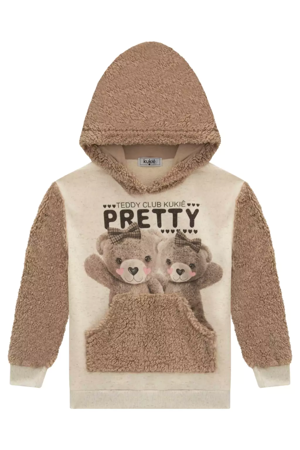 Blusão Infantil Alongado em Motetom Linho c/Capuz Pelo Carneirinho Ursinho Teddy - Kukie