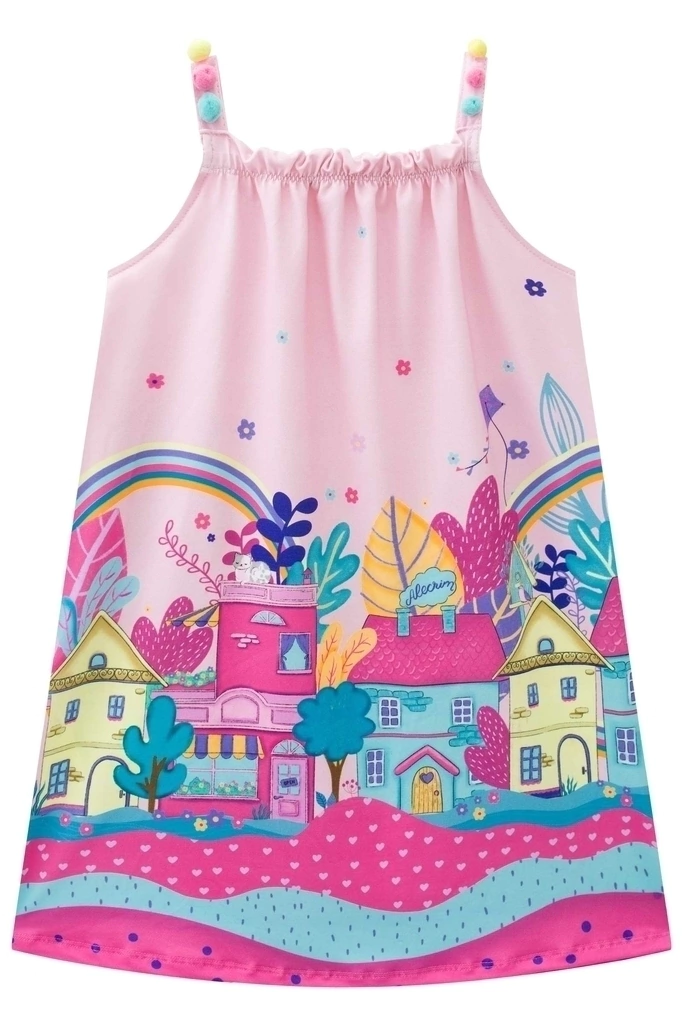 Vestido Infantil em Malha Power Casinhas Alças Pompom - Kukie